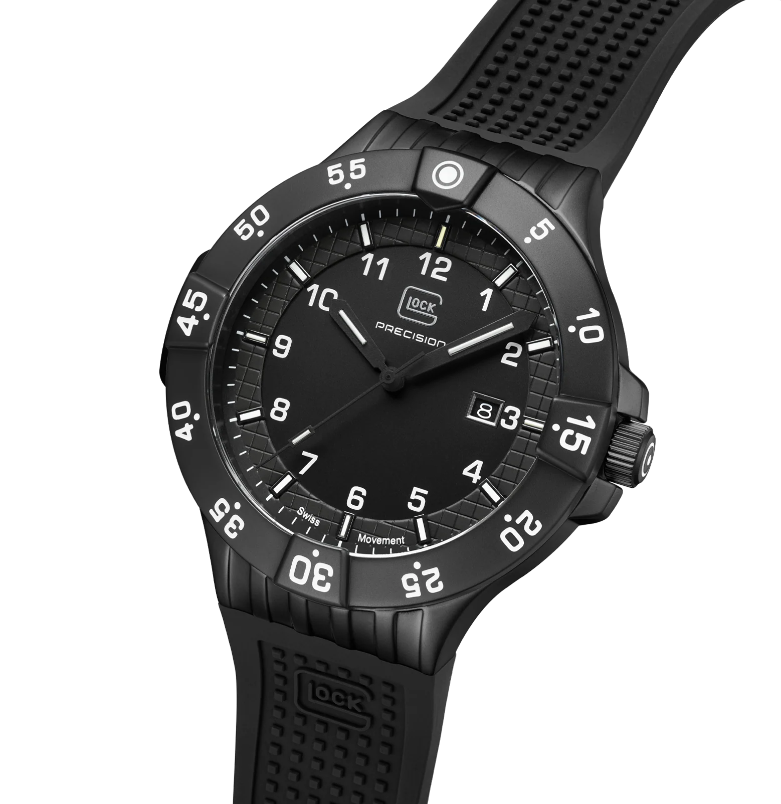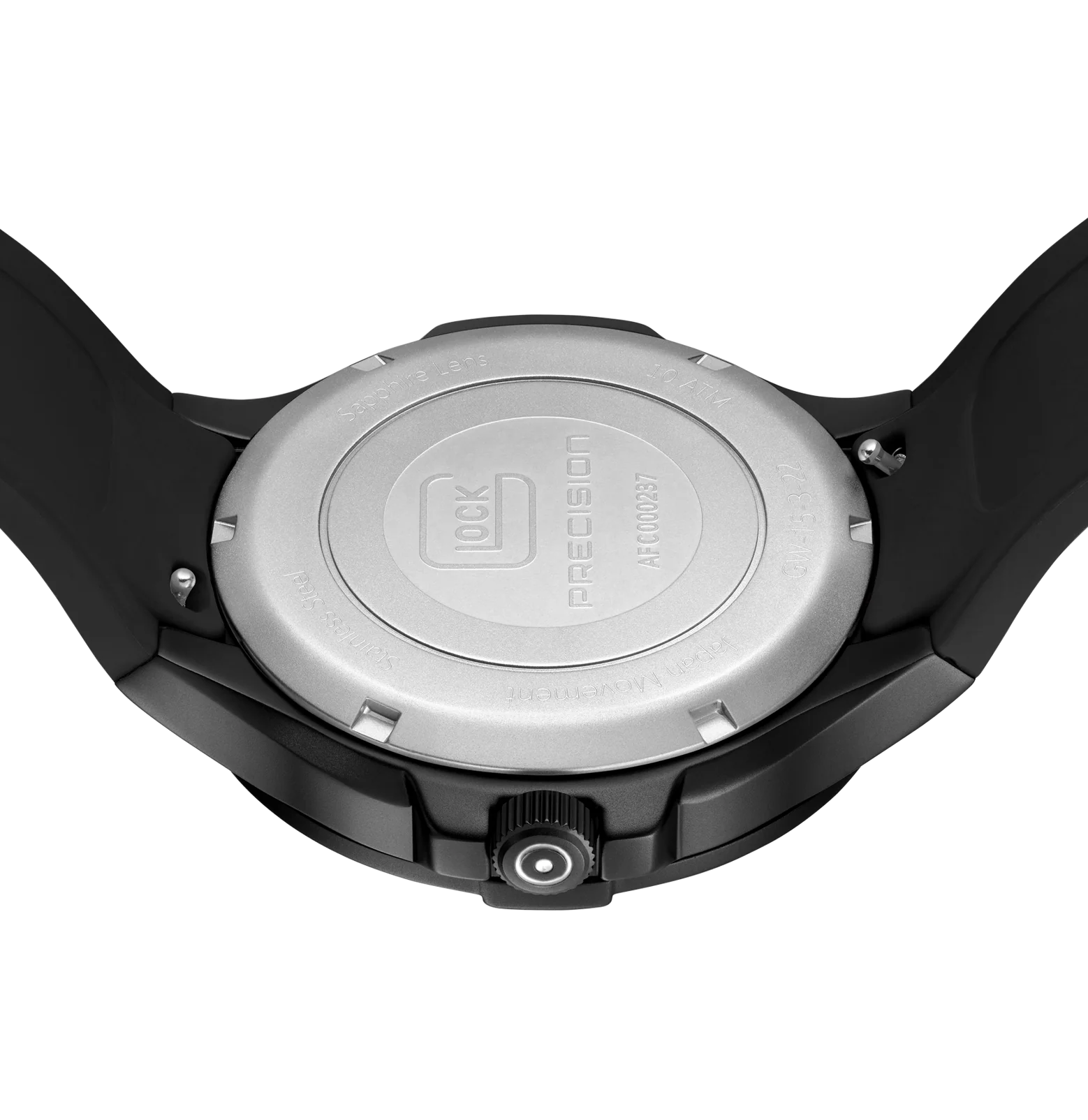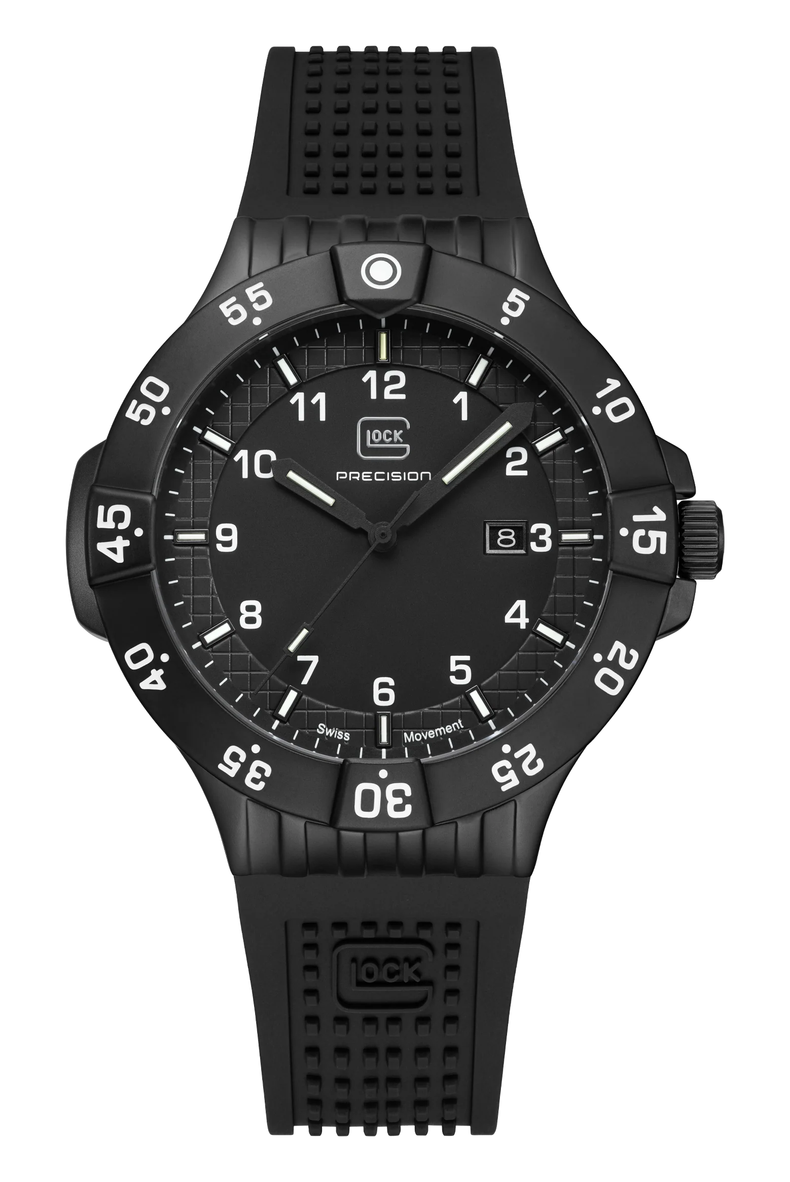 GW-15-3-22 Trigalight®, 20 atm water resistance, Swiss movement, Sapphire crystal, Rotating bezel, Swiss super-luminova®Encased in a gunmetal sandblasted stainless steel housing, the black dial features green Tritium tubes by Trigalight® at the 3, 6, and 9-hour markers, as well as on the second, minute, and hour hands, ensuring constant illumination. The 12 o’clock position is highlighted by a vibrant orange Tritium tube for enhanced visibility in low-light conditions. A black silicone strap with GLOCK's RTF texture encircles the wrist, creating an athletic look. Powered by a Swiss movement and rated to 10 ATM water resistance, this watch represents durability and resilience.Case Color: GunmetalStrap Color: BlackCase Material: Stainless SteelCase Thickness: 11.7 mmCase Diameter: 43 mmDial Color: BlackProduct Weight: 3.84 ozMovement Type: Swiss MovementStrap Material: SiliconeStrap Size: 200mmType of Clasp: Folding Clasp