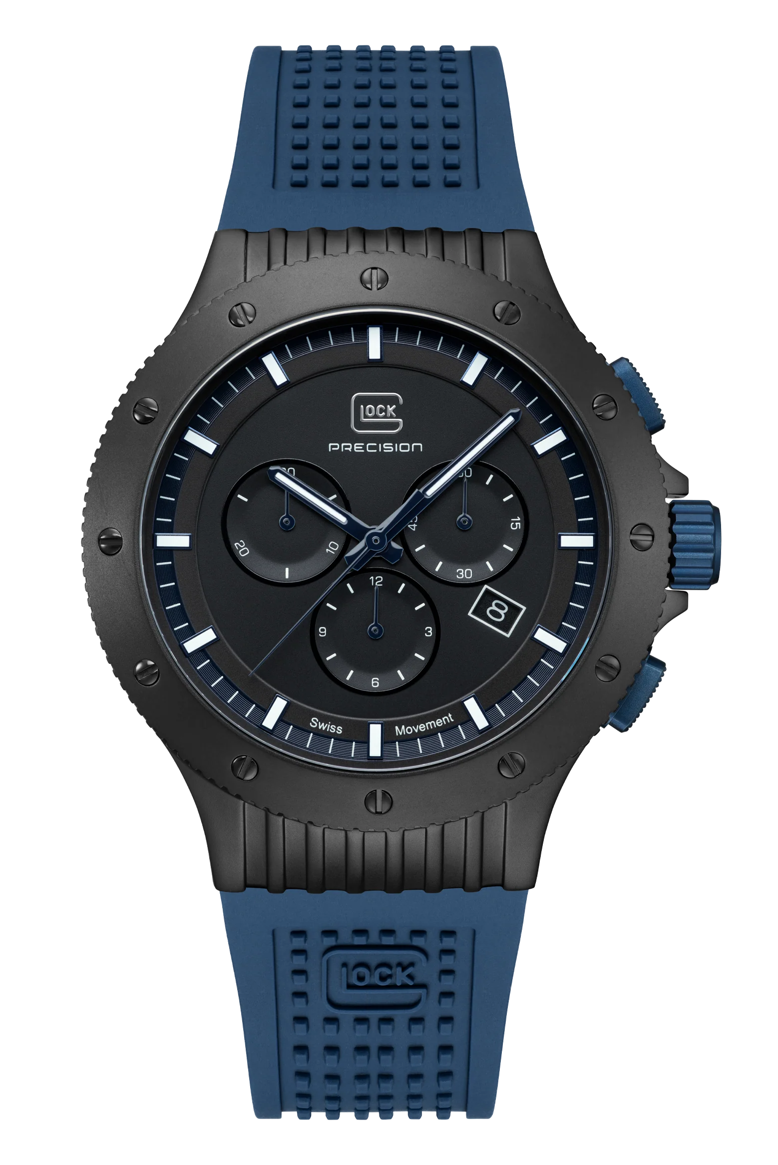 GW-27-2-24 This 7500-piece limited-edition wristwatch symbolizes precision craftsmanship. Its black titanium case is enriched by blue accents on the dial. Hands and indices with Swiss Super-LumiNova® ensure readability of the time even in low-light conditions. The watch is powered by a reliable Swiss movement, features a chronograph function, and boasts a water-resistance rating of 20 ATM. To offer versatility of style, each order comes with two interchangeable straps: a blue silicone strap with GLOCK's RTF texture and a black mesh strap. $799.00
