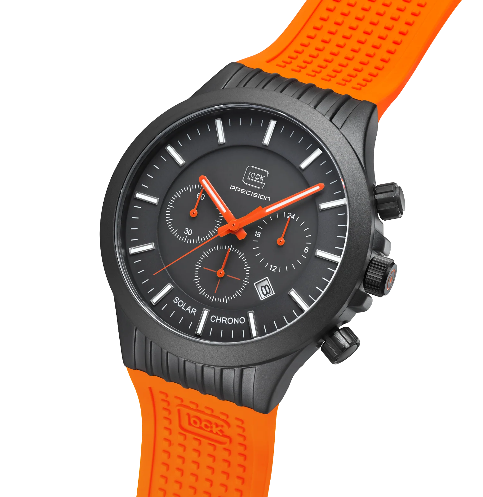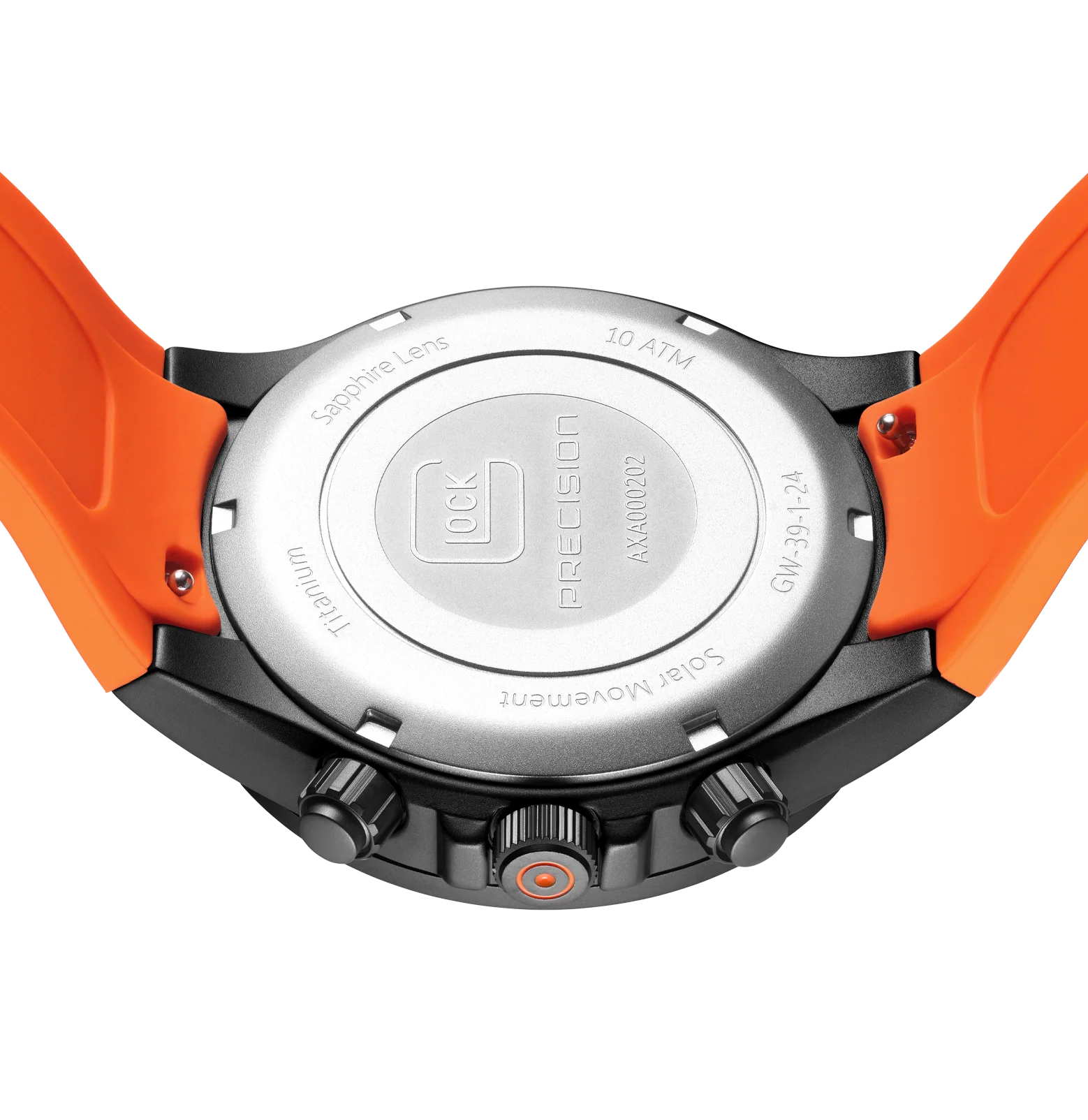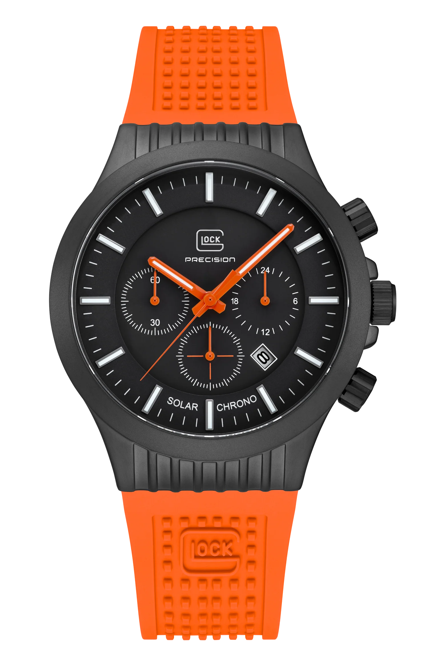 GW-39-1-24 10 atm water resistant, Solar watch, Chronograph, Swiss super-luminova® Elegant design combined with technical features. Framed in black sandblasted stainless steel, the black dial in combination with the brigth orange RTF-textured silicone strap give the watch a sporty appearance. Hands with Swiss Super-LumiNova® ensure clear readability, while the orange hands add a striking accent. Powered by a solar movement, this watch features a chronograph function and a 10 ATM water-resistance rating, presenting high-quality design without compromising on technology. Case Color: BlackStrap Color: Orange