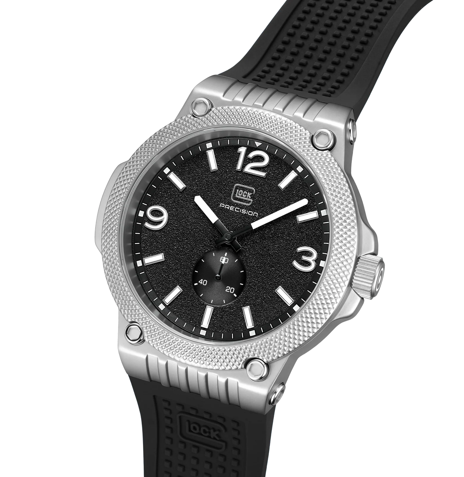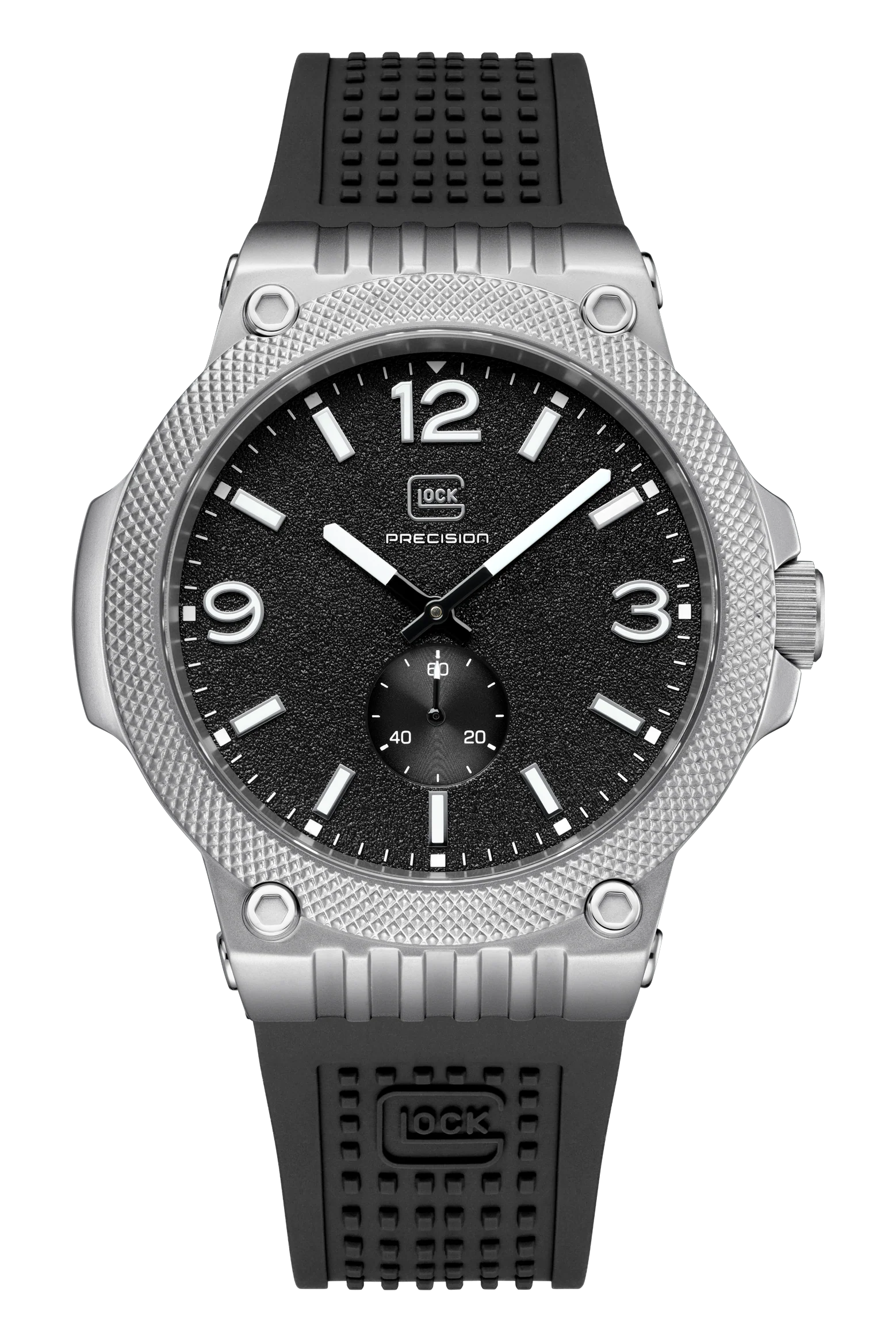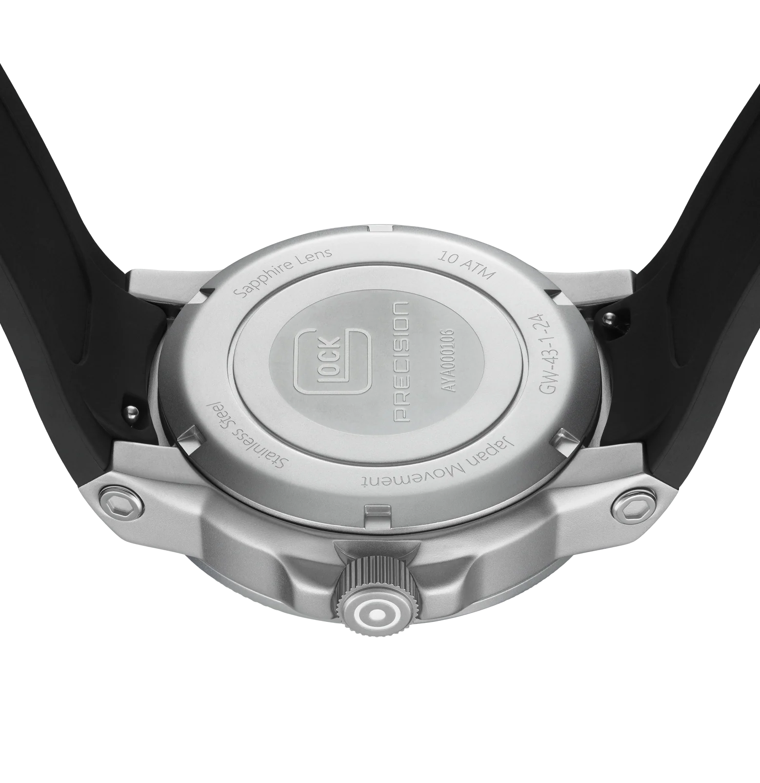 GW-43-1-24 10 ATM WATER RESISTANCE, SWISS SUPER-LUMINOVA® Strength and clarity define this high-performance GLOCK timepiece. The matte silver stainless steel case is encircled by a bezel with the iconic RTF texture - mirroring the signature grip design of GLOCK’s core product. Its black textured dial features bold white indices and numerals at 12, 3, and 9, all equipped with Swiss Super-LumiNova® for uncompromised visibility. A dedicated sub-dial at 6 o’clock tracks the seconds with precision. The black silicone strap, also structured with the RTF pattern and branded with the GLOCK logo, offers a secure, comfortable fit. Finished with a scratch-resistant sapphire crystal and engineered for durability, this watch is water-resistant to 10 ATM - ready for every mission and moment.Case Color: Silver-ToneStrap Color: BlackCase Material: Stainless SteelCase Diameter: 43 mmDial Color: BlackMovement Type: Japanese MovementStrap Material: SiliconeStrap Size: 240mmType of Clasp: Folding Clasp