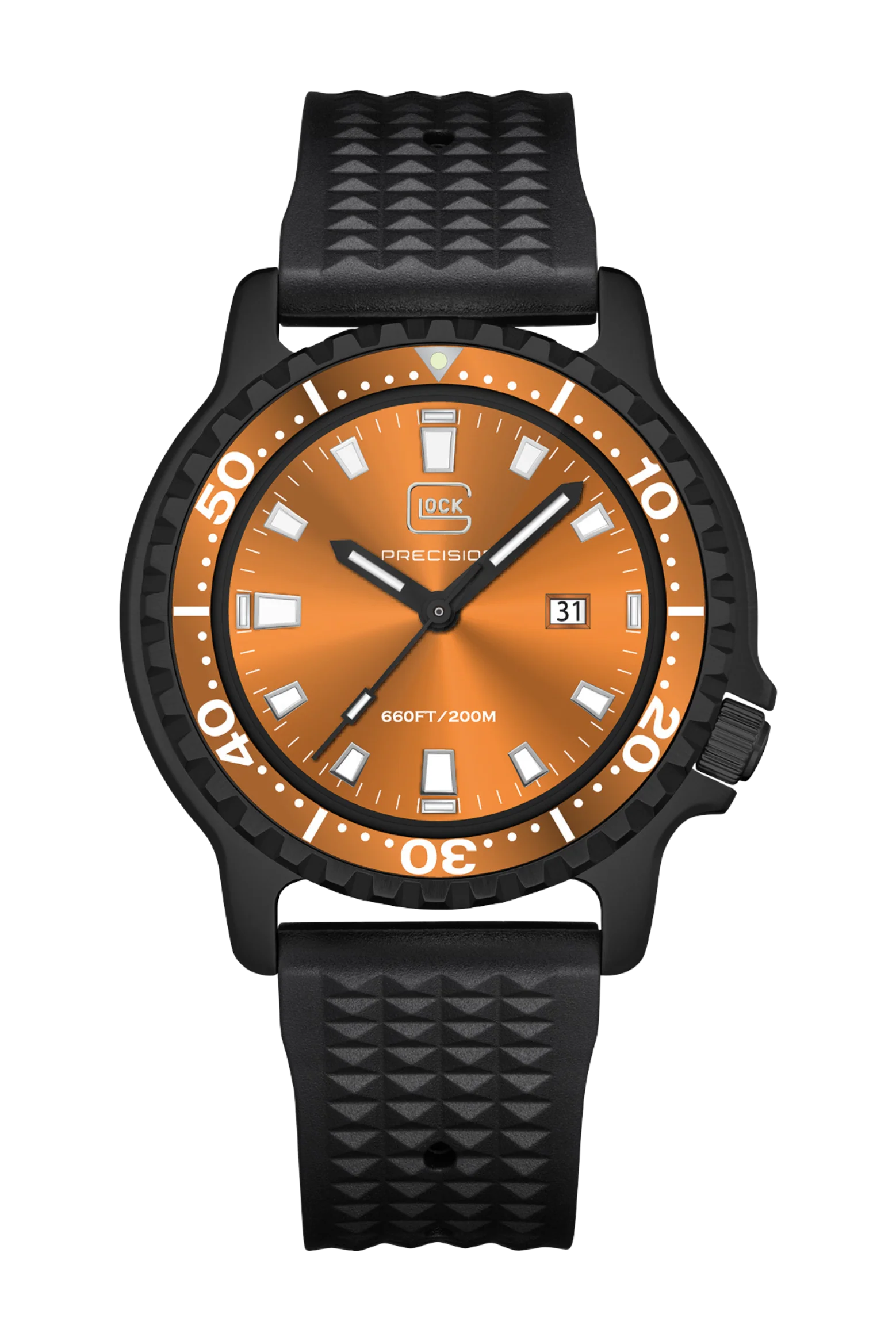 GW-44-4-22 20 ATM WATER RESISTANCE, ROTATING BEZEL, SWISS SUPER-LUMINOVA®, TRIGALIGHT®, SWISS MOVEMENT Bold aesthetics meet uncompromising performance in this diver-style timepiece. The matte black stainless steel case surrounds a vivid orange dial that commands attention while ensuring optimal readability beneath any light condition. White-accented hands and indices stand out sharply against the dial, enhanced by Trigalights® at the 12, 3, 6, and 9-hour positions and Swiss Super-LumiNova® on the remaining markers. The black silicone strap offers lasting comfort and durability, perfectly complementing the watch’s dynamic character. Driven by a precise Swiss movement and water-resistant to 20 ATM, this watch unites functionality, resilience, and the unmistakable confidence of GLOCK design.Case Color: BlackStrap Color: BlackCase Material: Stainless SteelCase Diameter: 45 mmDial Color: OrangeMovement Type: Swiss QuartzStrap Material: SiliconeStrap Size: 200mmType of Clasp: Folding Clasp