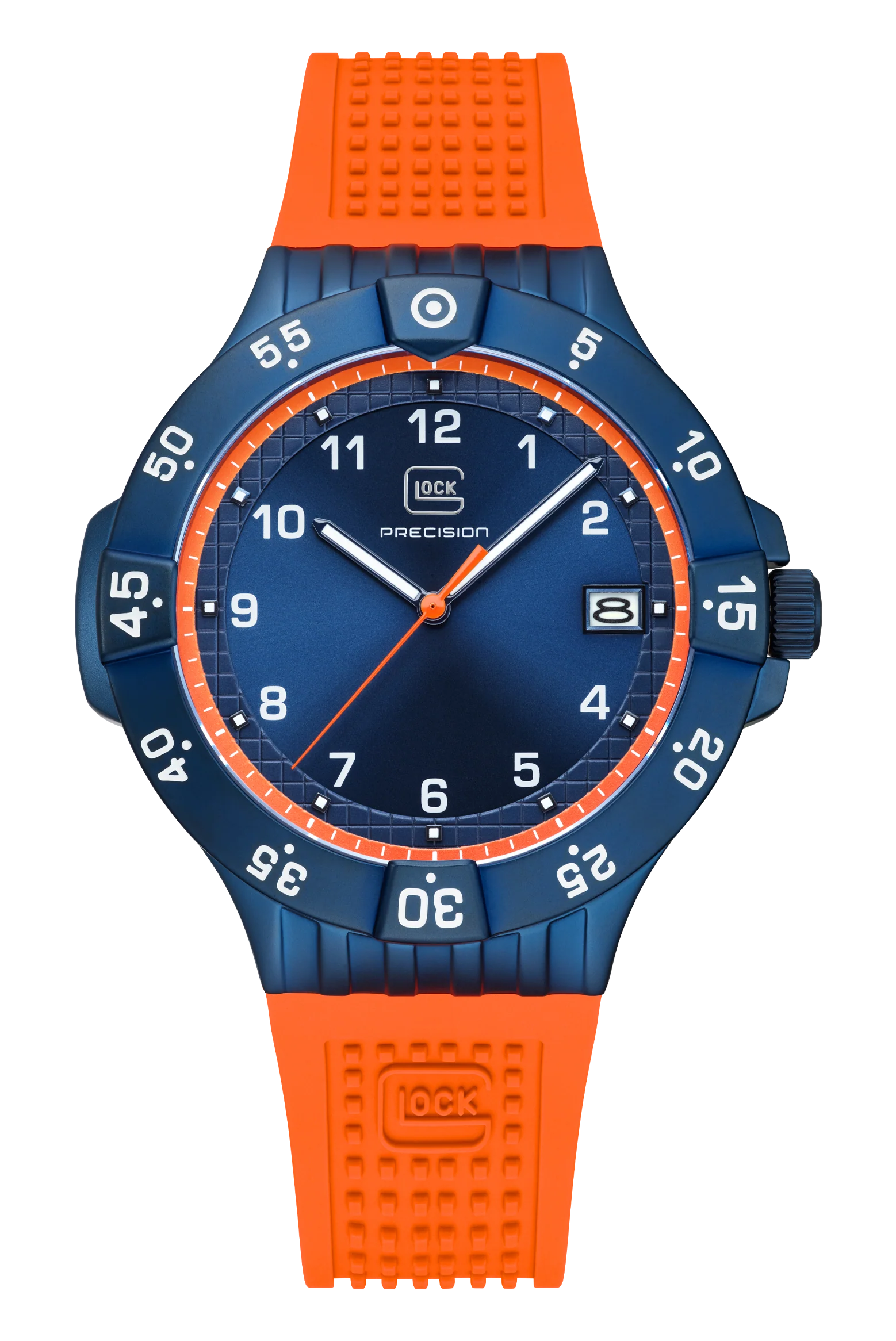 GW-15-8-22 This 5000-piece limited-edition wristwatch symbolizes precision craftsmanship. Encased in a blue stainless steel housing, the blue dial with orange accents features hands and indices with Swiss Super-LumiNova® and a striking orange second hand. With a rotating bezel and rated to 10 ATM water resistance, this watch represents durability and resilience. To offer versatility of style, each order comes with two interchangeable straps: a orange silicone strap with GLOCK's RTF texture and a all new blue rubber textile strap with orange stitching.