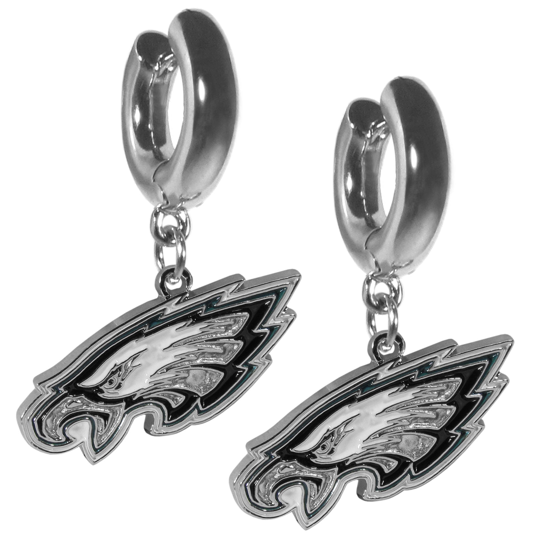 Description: Our Philadelphia Eagles huggie hoop earrings have a classic style with a sporty twist. The chunky hoop is 3/4 inch diameter and 1/4 inch thickness with a fully cast metal team charm. The simple lock clasp on the earrings makes them very secure during all types of activity. Features: Officially licensed NFL product Classy 3/4 inch chunky hoop earring with dangle team charm Easy lock clasp secures the earring for all types of activity Super easy to take on and off Perfect addition to a Philadelphia Eagles game day outfit! Weight: 0.03 lbs. Width: 2.00 in. Length: 3.00 in. Height: 0.15 in. Manufacturer: Siskiyou Buckle