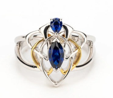Silver and 18k Vermeil Lab Grown Sapphire Alchemy Angel Ring Alchemy & Echoes  - A celebration of your past, your light, and the beauty of becoming. Materials: Rhodium Sterling Silver and 18k Vermeil with Lab Grown Sapphire (Marquise 8mm x 4mm, Pear 4mm x 3mm) Dimensions (width): 18mm x 2mm (tapered) Ring sizes: All ring sizes are in US ring sizing.
